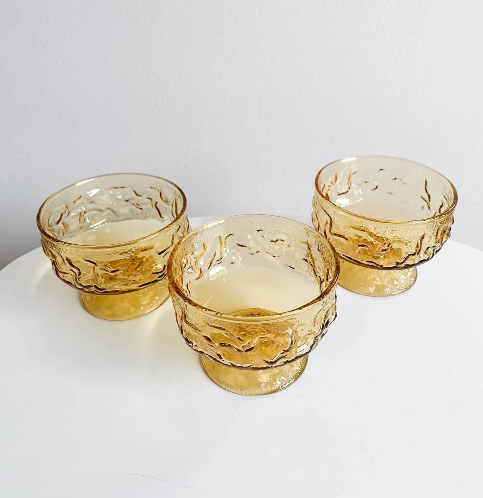Set of 3 vintage Anchor Hocking “Lido Milano” glass dishes in warm amber tone, made in the USA in the 1960s. The design features an organic, irregular surface pattern - reminiscent of rippled water or molten glass, that catches the light beautifully and gives each piece a tactile quality.