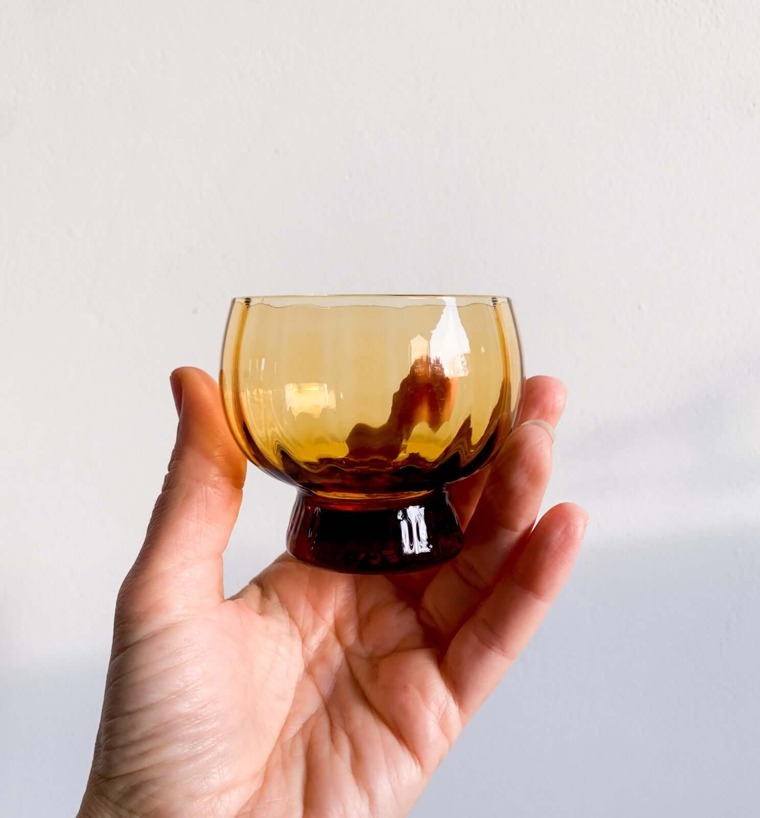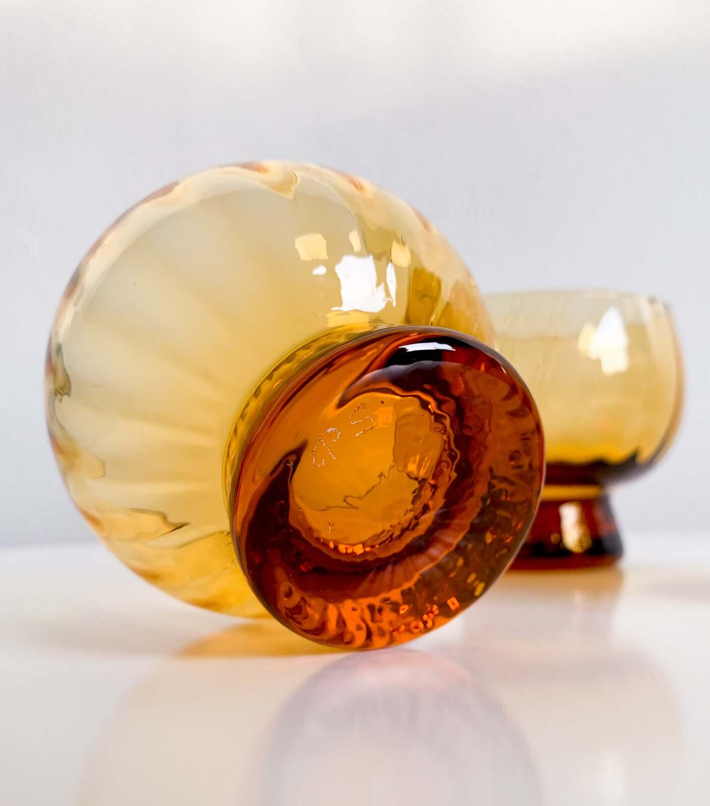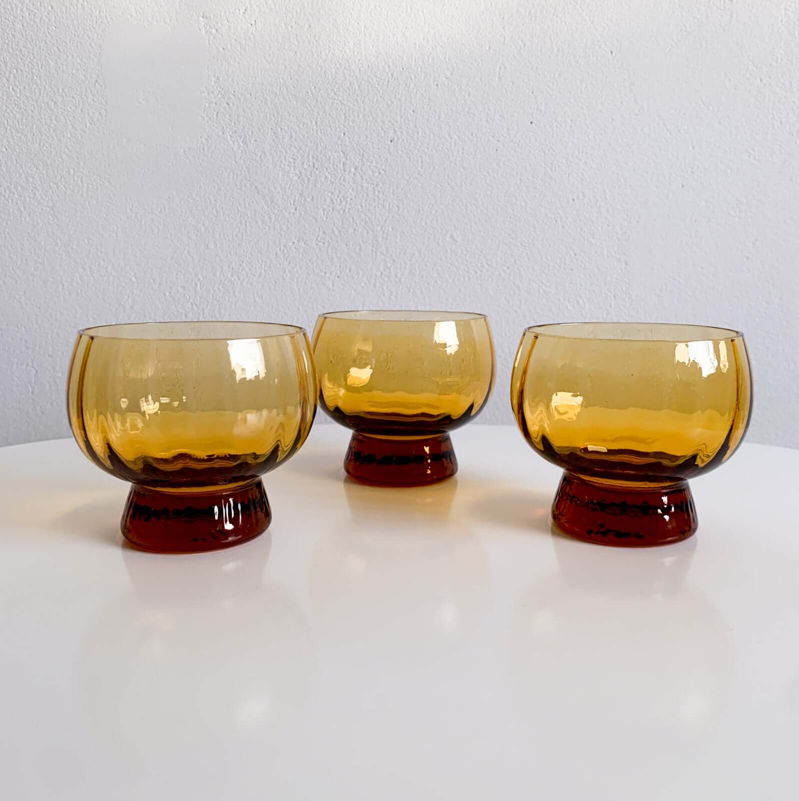 Each piece features a warm amber tone, shifting beautifully in light from amber to dark honey. The thick, sculptural base contrasts with the round organic bowl, a hallmark of Finnish modernist glass design.