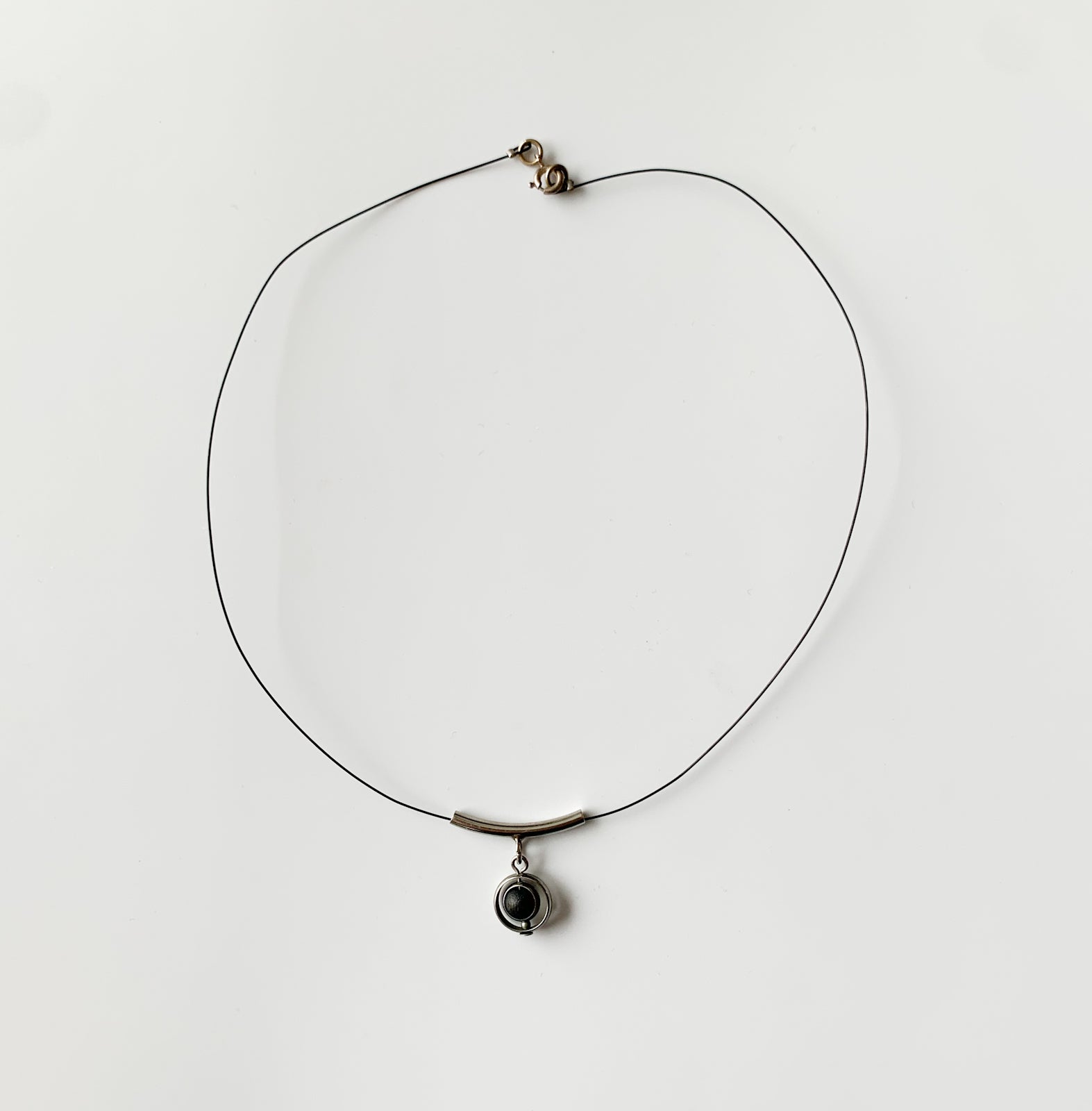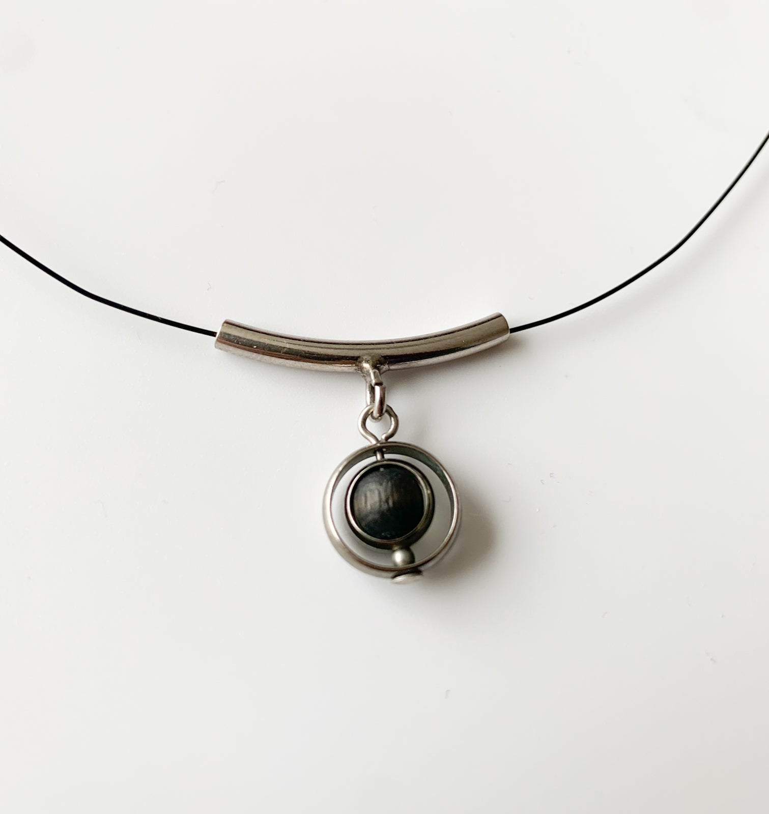 Original necklace from the Aarikka Jive series. Compact geometric composition combining a curved metal bar and a suspended circular element with a dark wooden bead. Light in weight, balanced proportions.