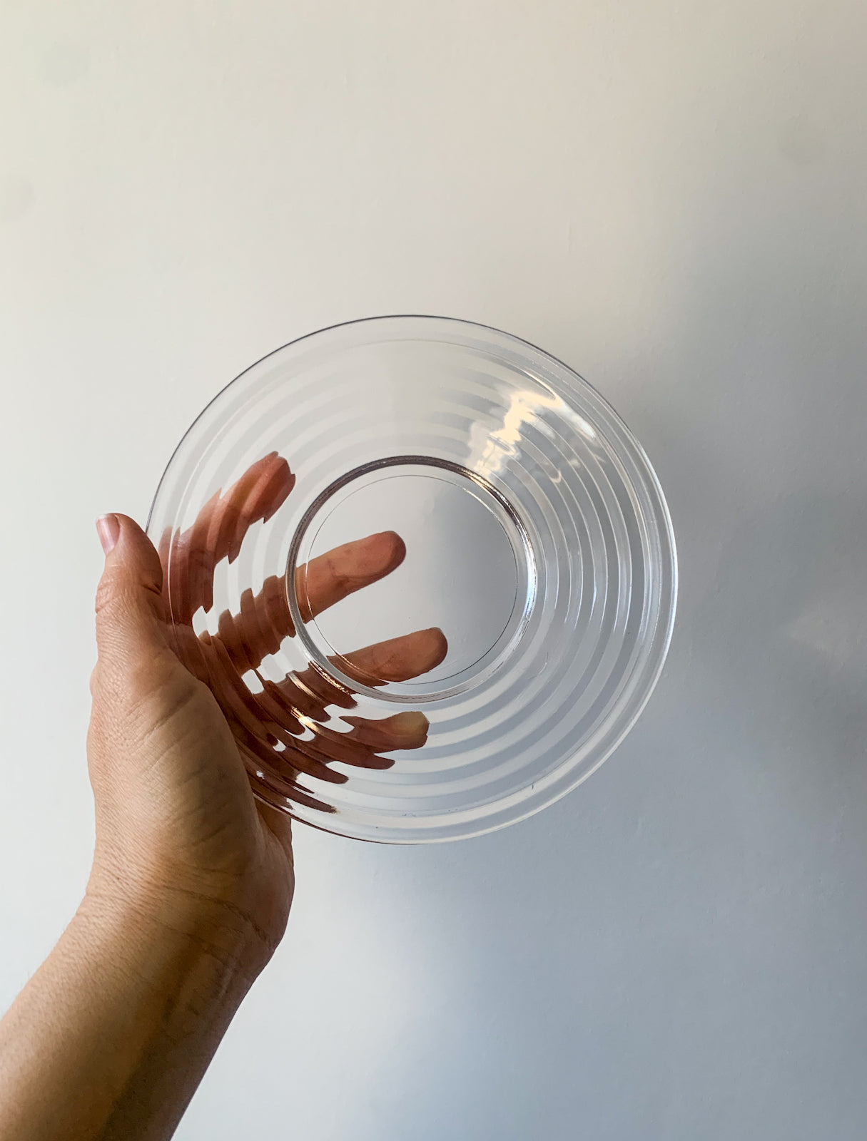 Set of three clear glass dessert plates from the iconic Aalto tableware series designed by Aino Aalto. The design is based on concentric, stepped rings that create a calm visual rhythm and clear geometry. The plates work equally well for desserts, starters, or everyday table use.