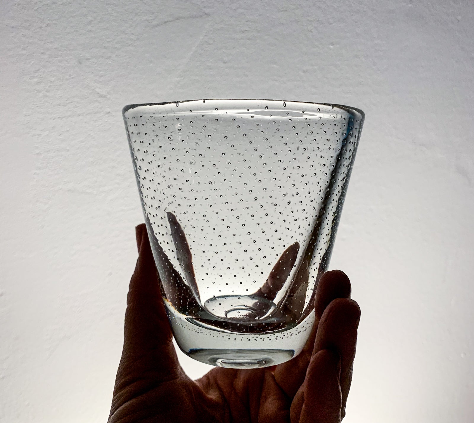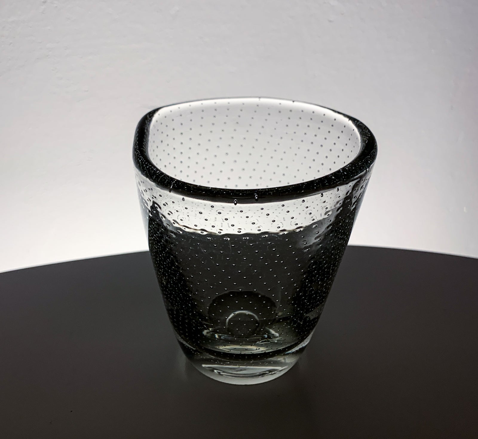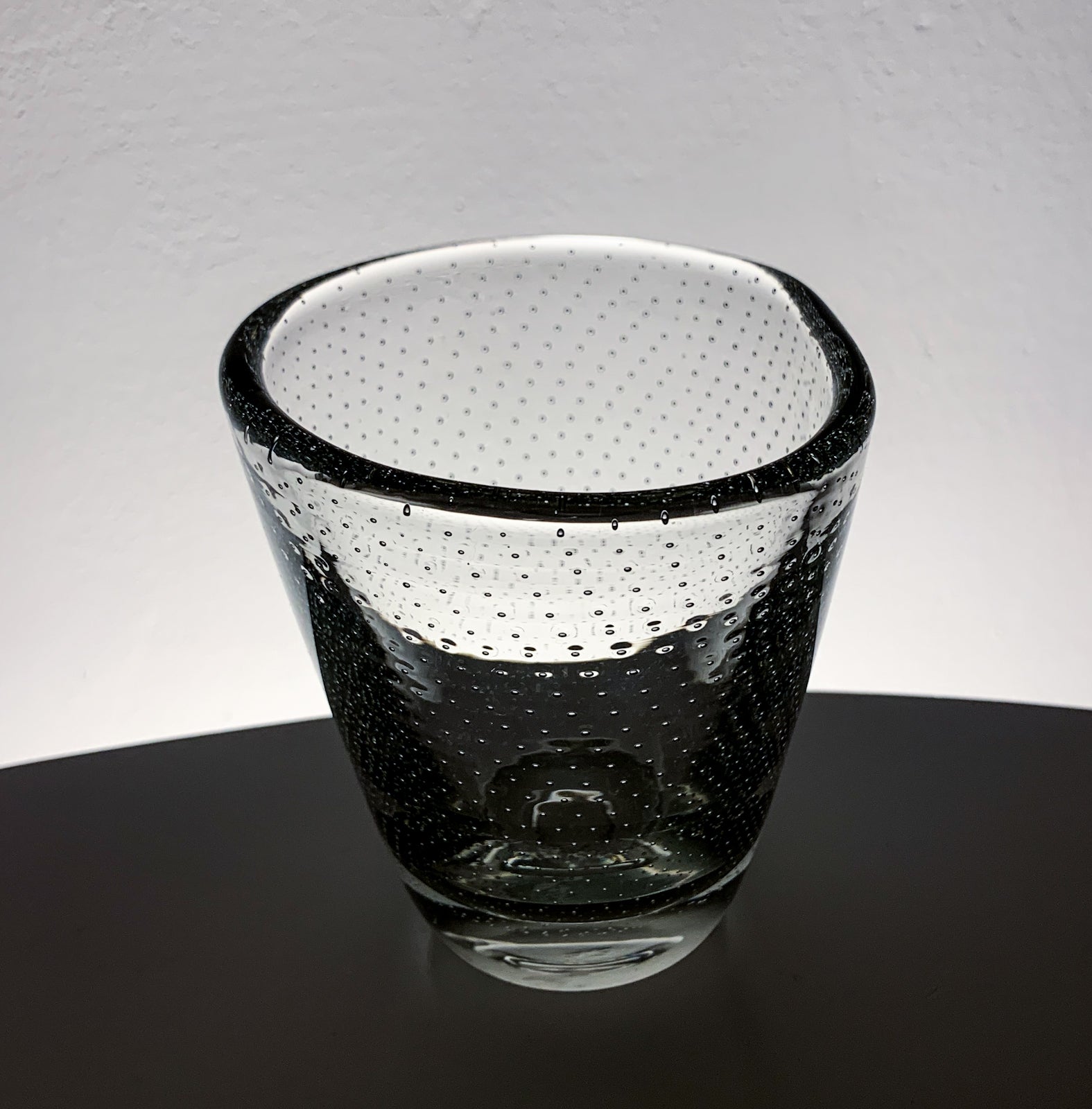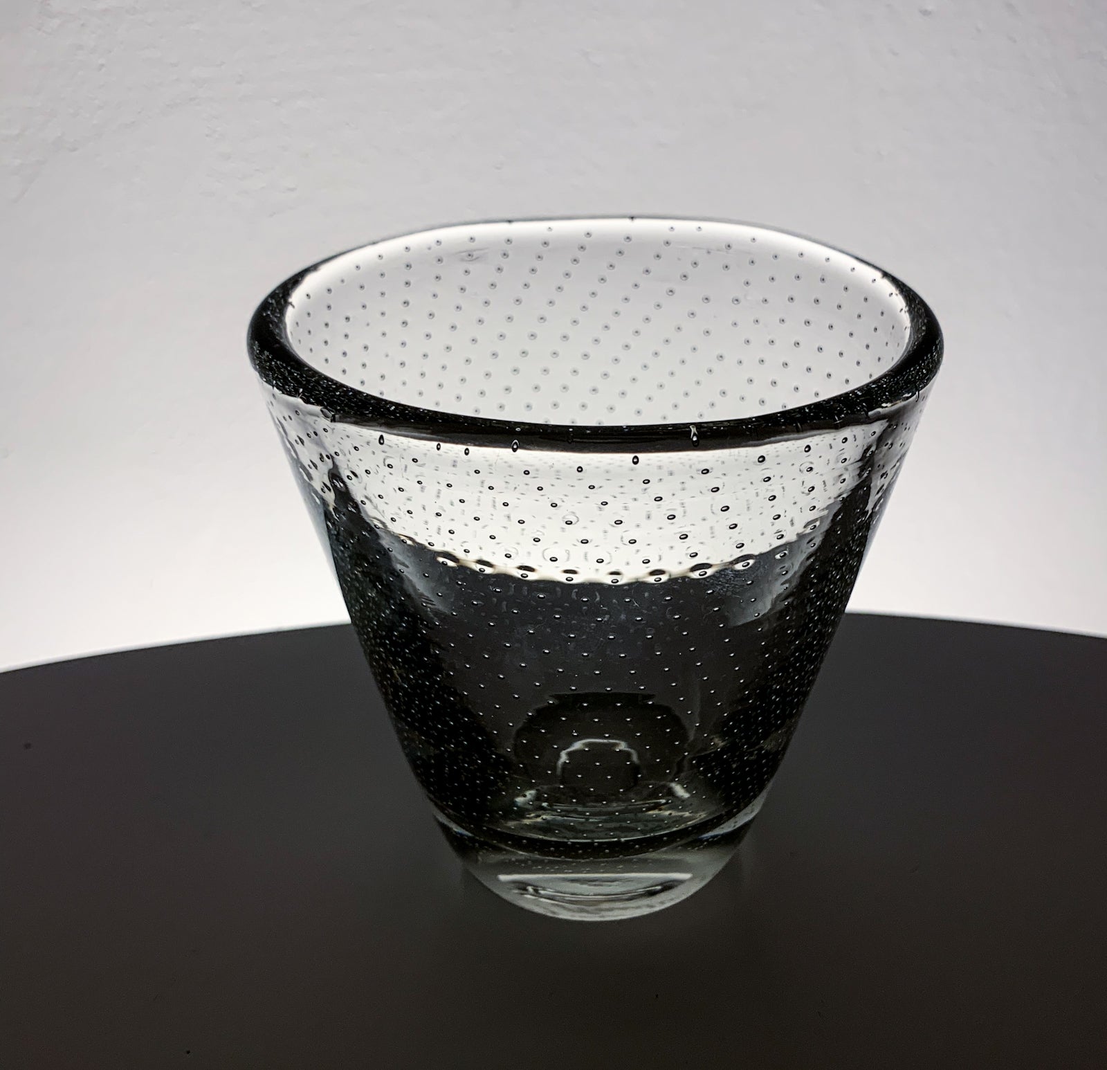 The form is compact and slightly tapered, with a thick base and a gently flared rim. The silhouette remains simple, allowing the internal structure of bubbles to define the visual impact.