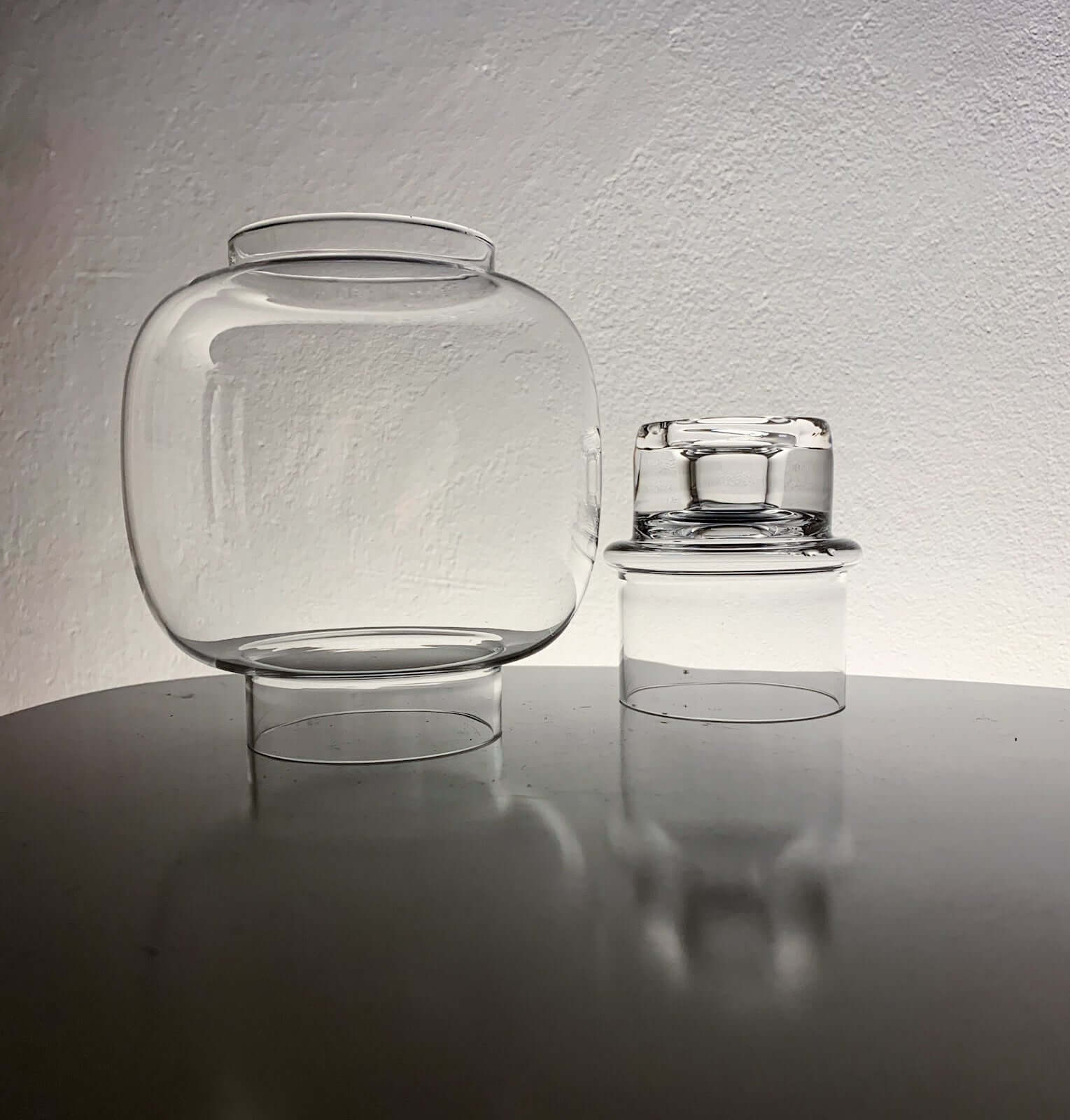 Crafted in clear glass, the piece is composed of two interlocking parts: a cylindrical base with a broad rim for stability, and a rounded dome-shaped top with an open mouth for dispersing candlelight. The modular design allows the upper part to sit snugly in the base, creating a lantern-like silhouette that's both sculptural and functional.