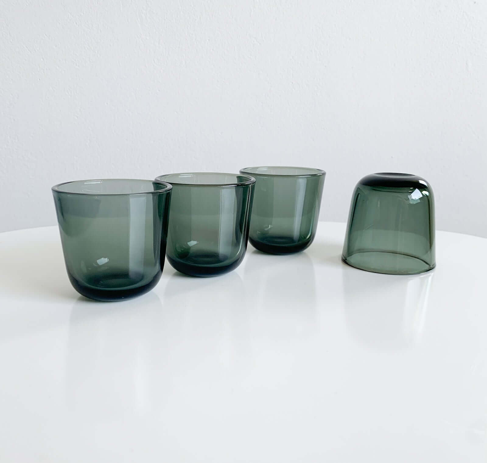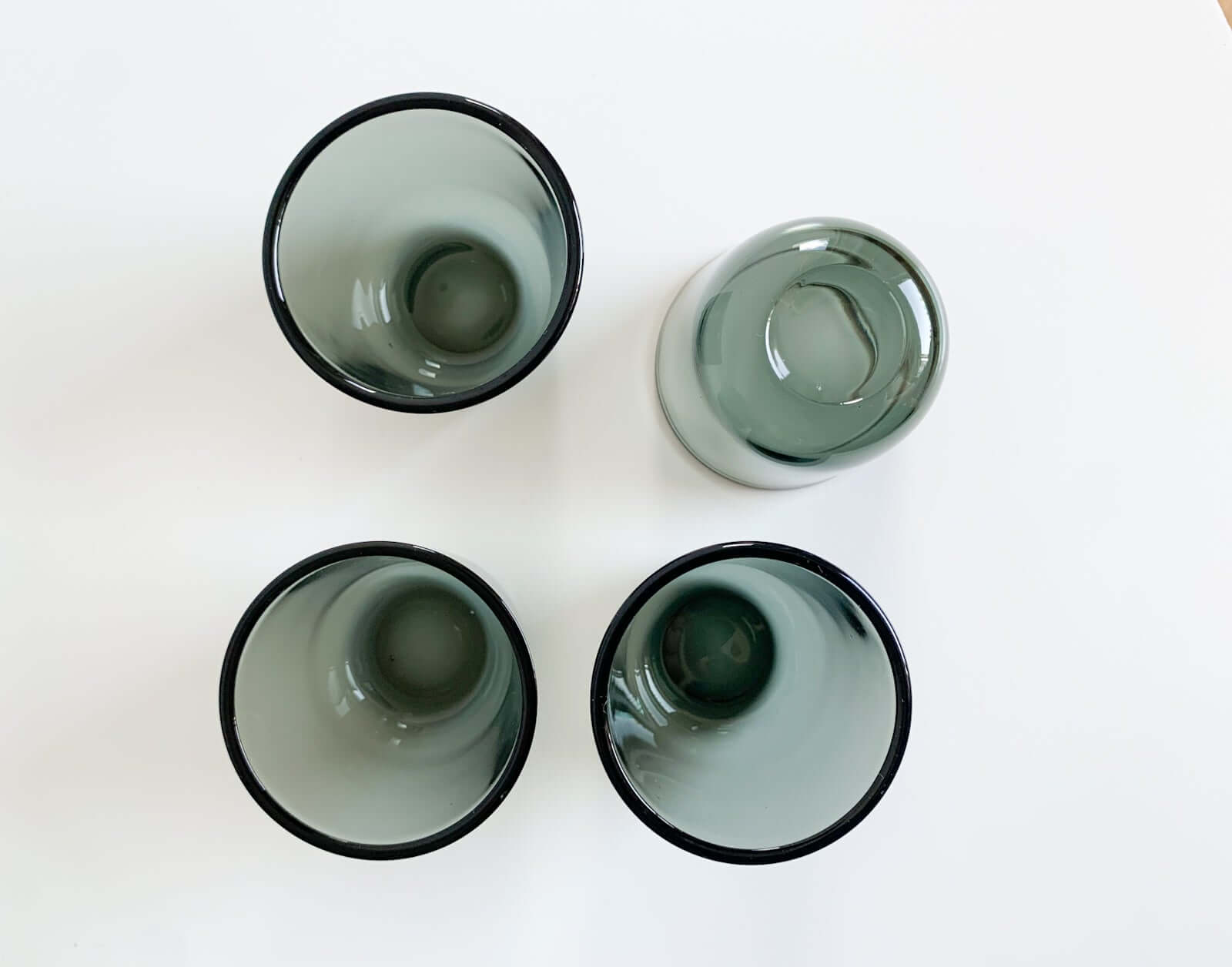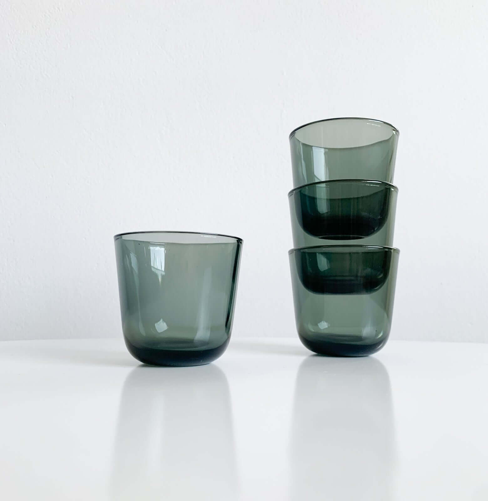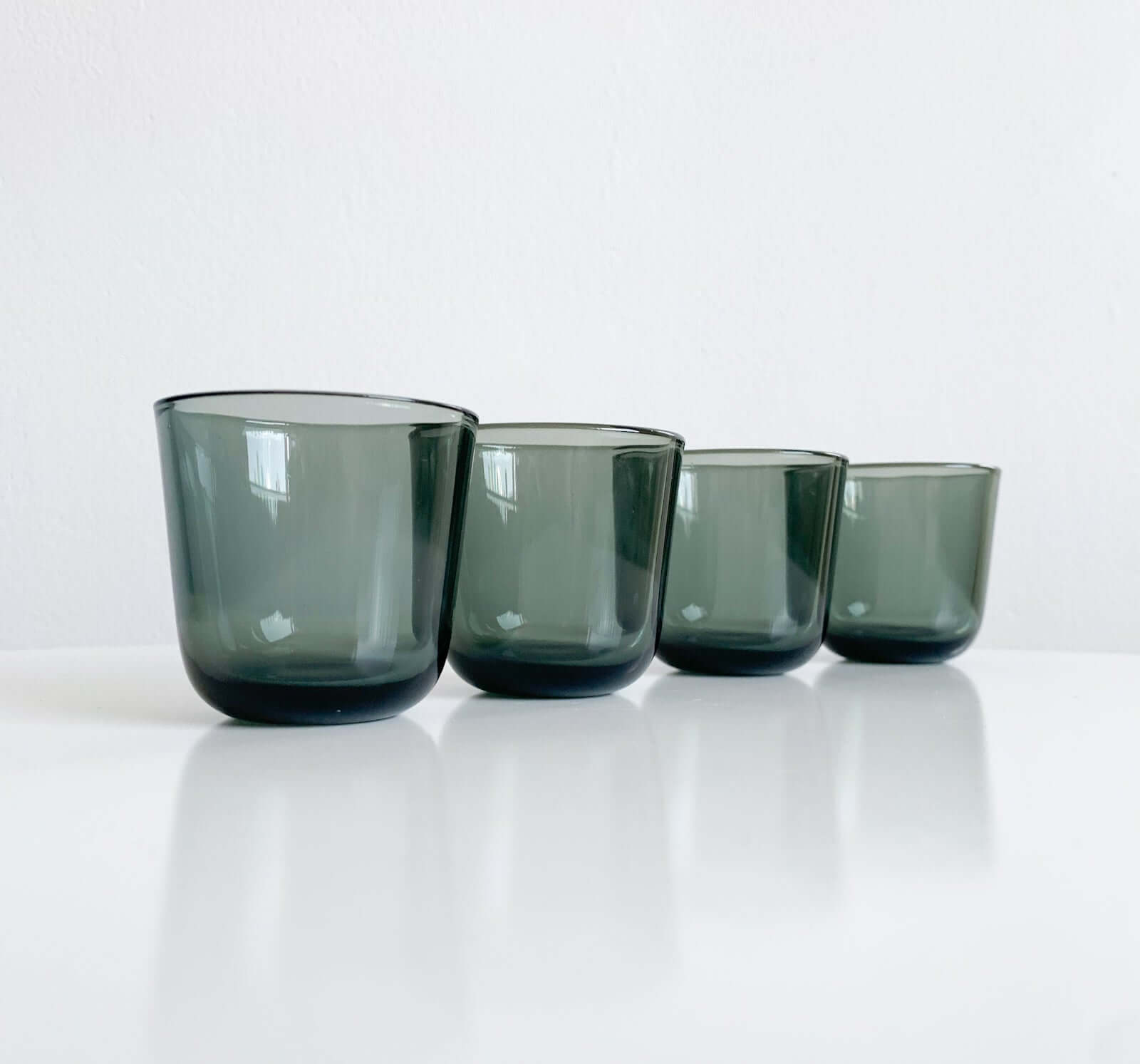 They are small yet sturdy, made of thick glass, characteristic of midcentury Scandinavian design. Their simple, functional shape reflects Franck’s philosophy of minimalism and practicality, making them ideal for serving spirits or small drinks. The light plays beautifully through the colored glass, emphasizing their timeless elegance.