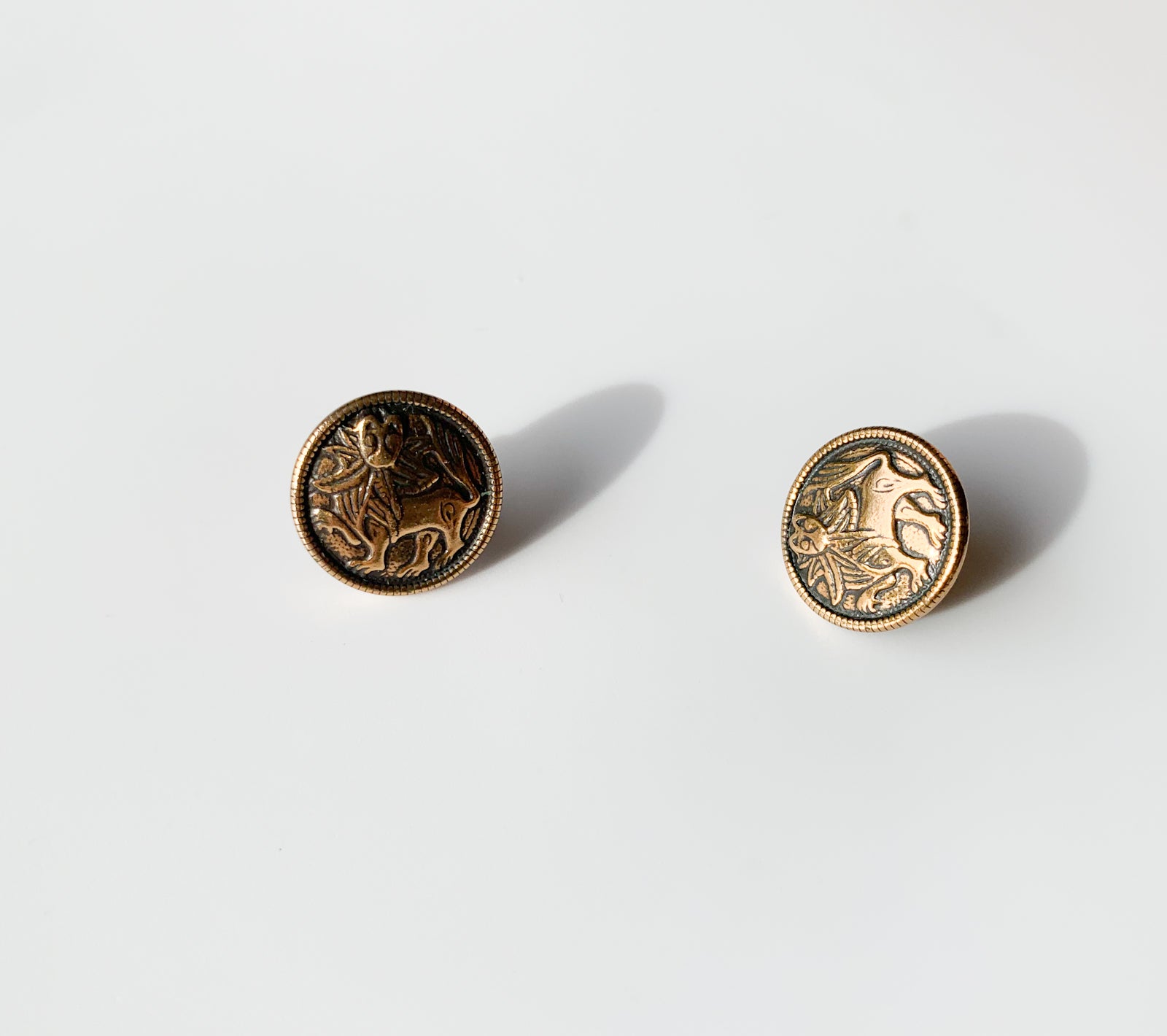 Vintage stud earrings belong to the Aurinkoleijona (Finnish for Sun Lion) series created by Kalevala Koru in 1997 for the company’s 60th anniversary. The motif shows a lion with a radiating mane, symbolizing strength, light, and protection. The design is directly inspired by medieval Finnish treasures.