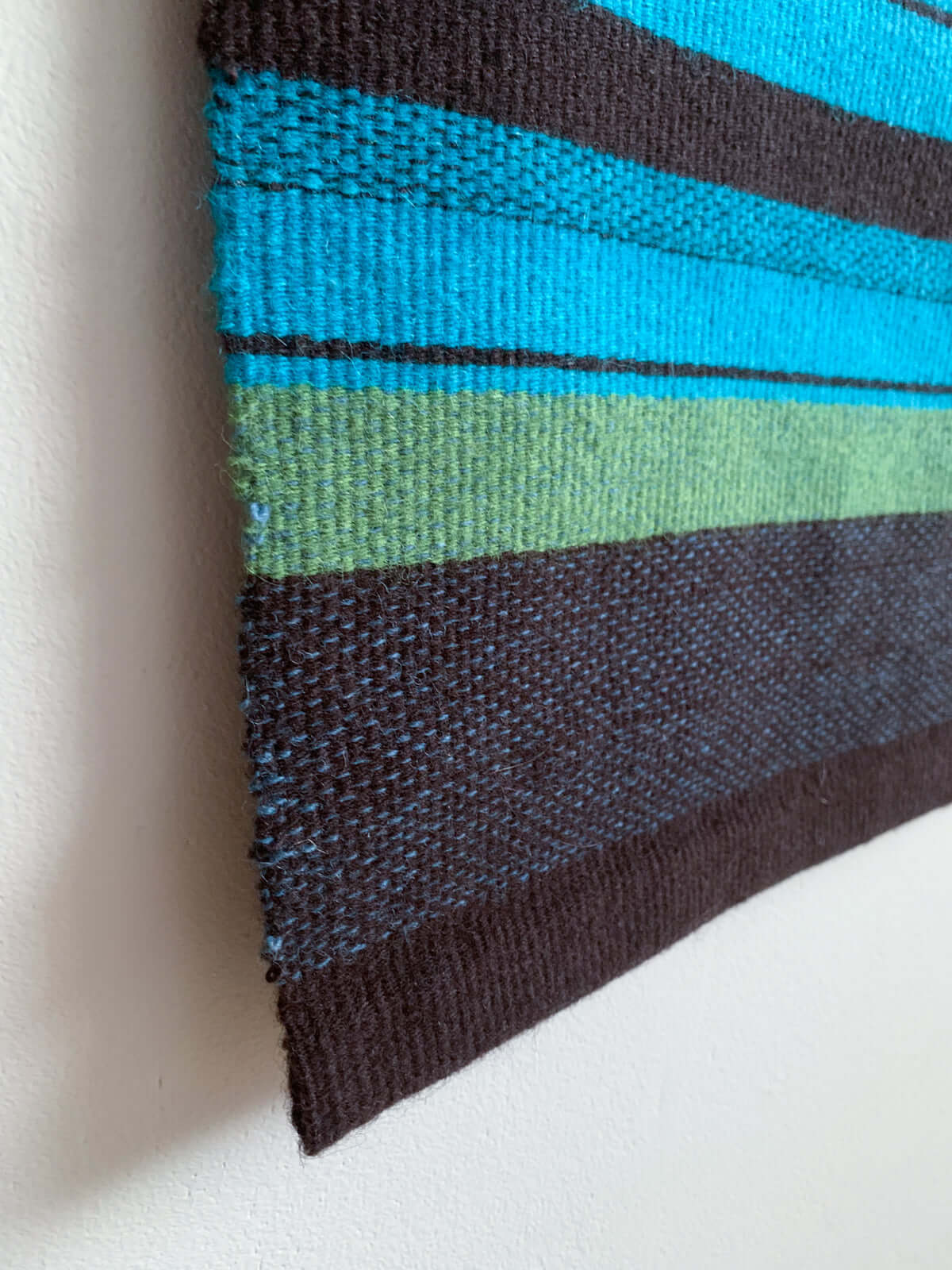 The tapestry presents a striking combination of turquoise, violet, deep brown, green, and small white accents. The composition creates a rhythm of horizontal bands that shift between calm sections and vivid contrasts - an interpretation that feels almost psychedelic compared to more traditional raanu palettes.