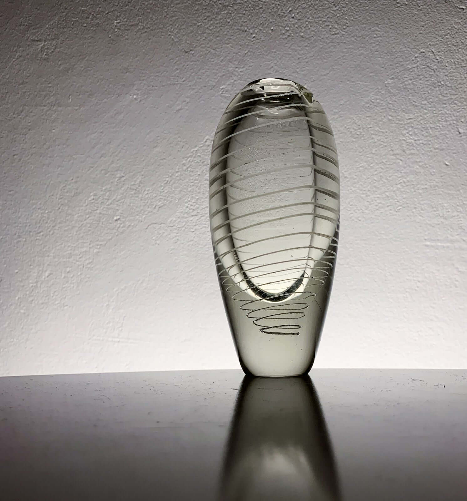 Art glass vase and artwork designed by Mikko Helander for Humppilan Lasi, Finland, in the 1960s. Created in filigree technique and shaped into an elongated oval form with clear glass carrying a soft grey tint.