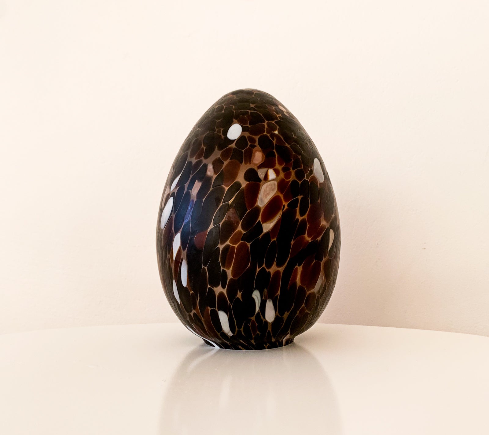 Hand-blown and shaped in the studio tradition of Swedish art glass, the egg carries a complex interplay of colour inclusions within the glass mass. Each spot and tone was integrated into the piece during the blowing and shaping process, not applied after the fact. This gives visual depth and a layered internal surface that shifts as the viewing angle changes.