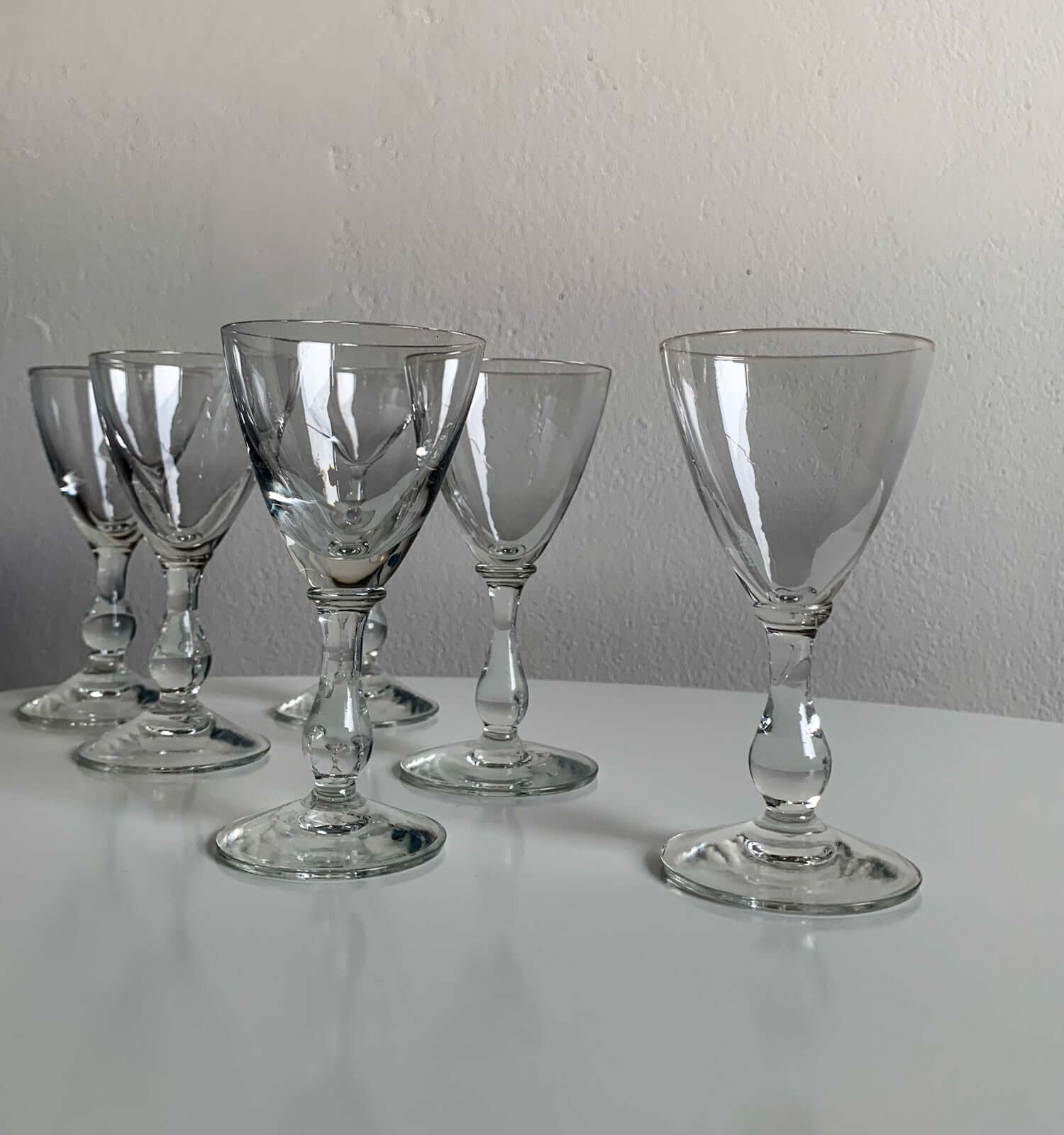 Vintage full set of 6 handmade liquor glasses from the Savoy series produced by Riihimäen Lasi in the 1940s. Although the name “Savoy” is strongly associated with Alvar Aalto’s famous vase, Riihimäki used the same name for a refined glassware line during the same period. These glasses show the elegance and clarity of Finnish glass design.
