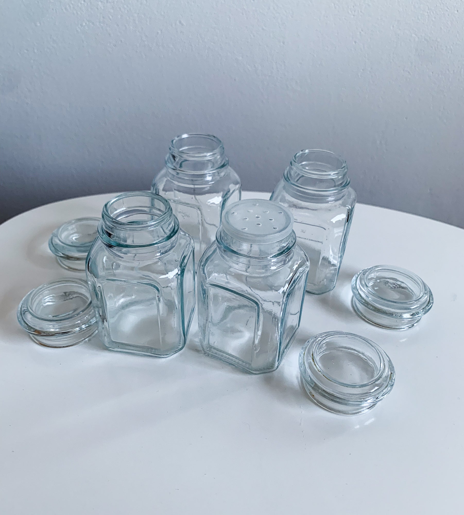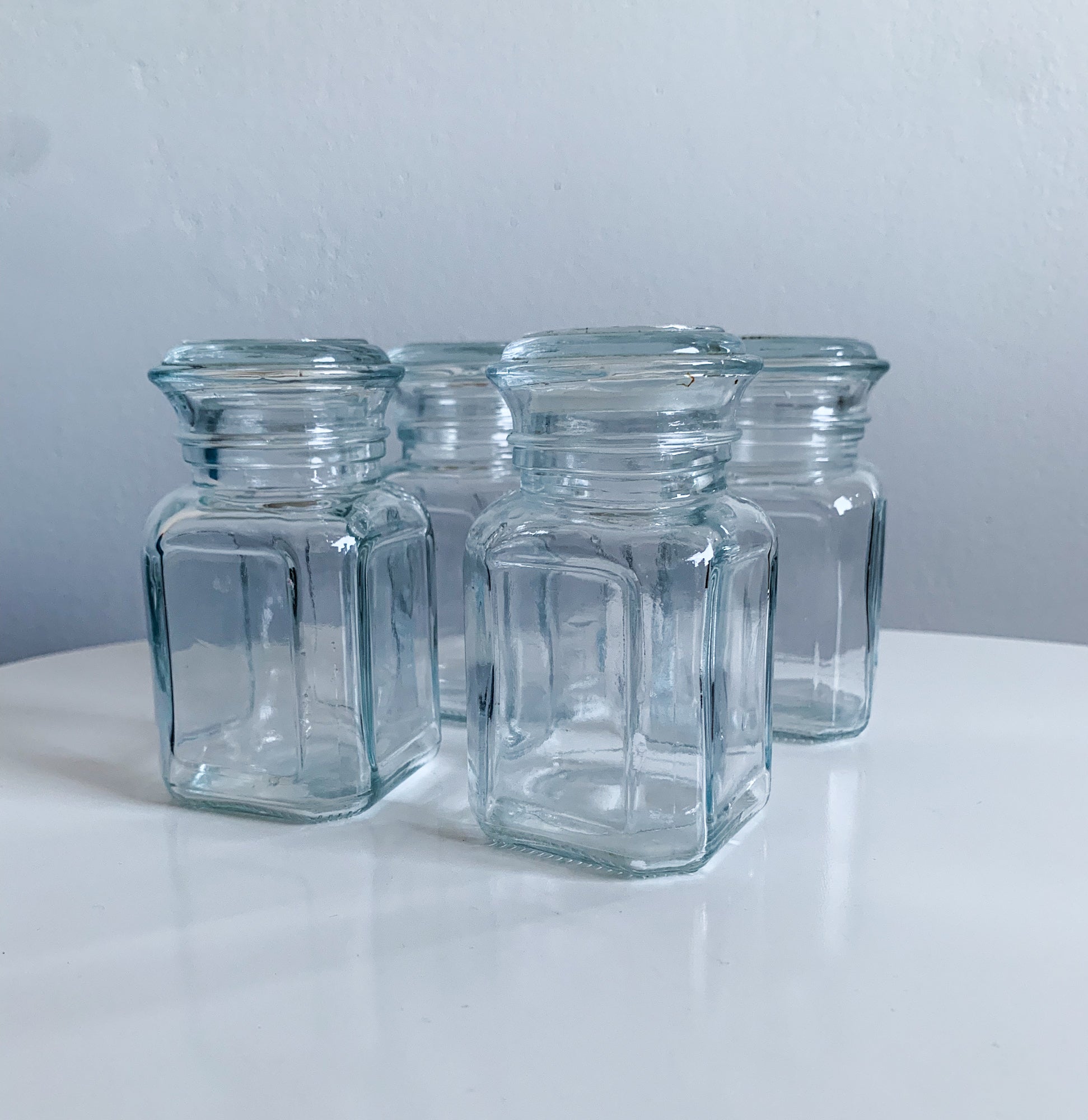 Set of 4 clear glass jars from Kantti series, one with shaker insert. Made on Riihimäki glassworks, 1980s. The jars are suitable for spices, e.g. salt and pepper.