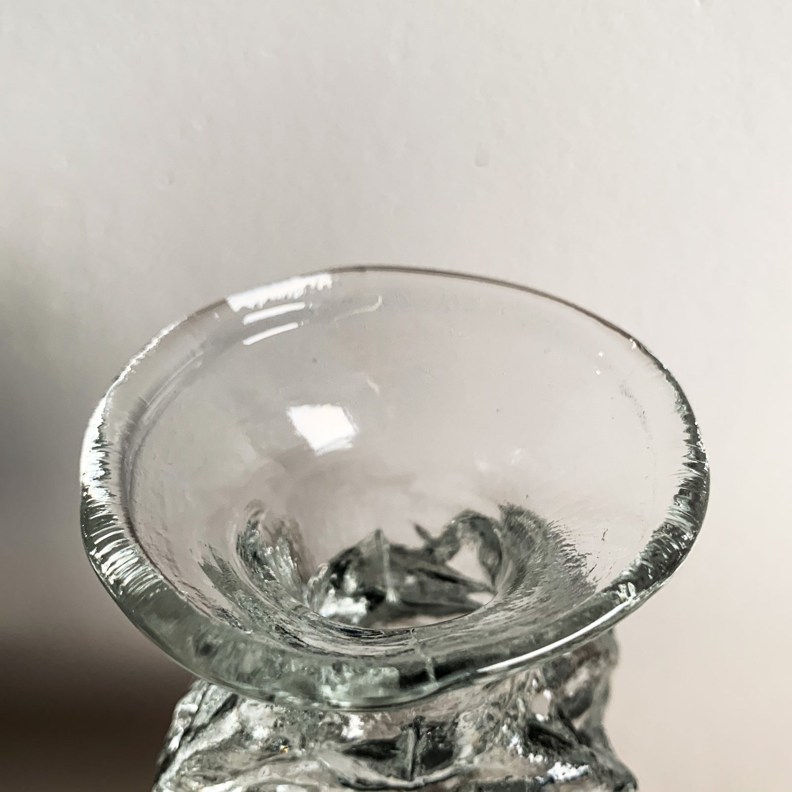 Handmade clear art glass with an organically shaped structure. The surface shows deliberate irregularities created during free form hot glass shaping.